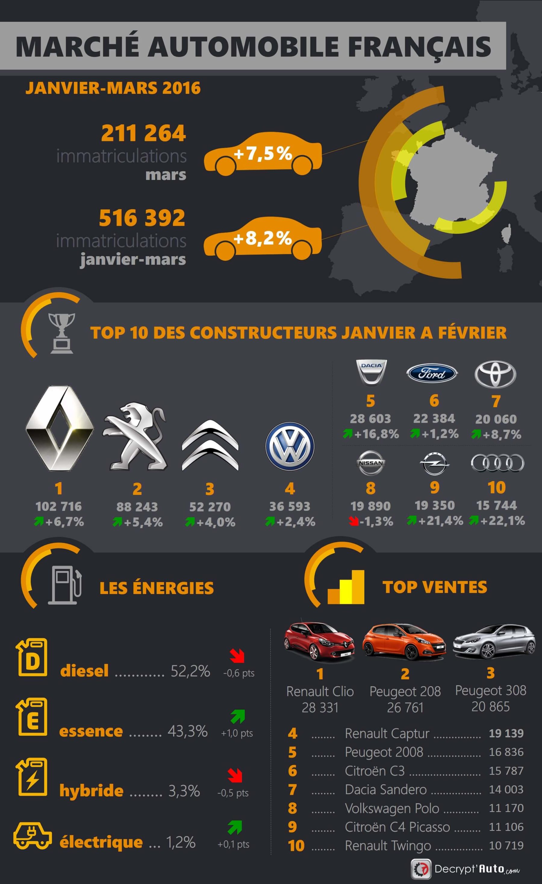 En France, le secteur se porte bien avec une augmentation du . Le marché automobile français bondit de 1 pour démarrer. France depuis janvier, au premier rang desquels la Renault Clio,. Les constructeurs automobiles français font beaucoup moins bien que. Dans le détail, en France, Peugeot, Renault et Citroën voient leurs ventes.